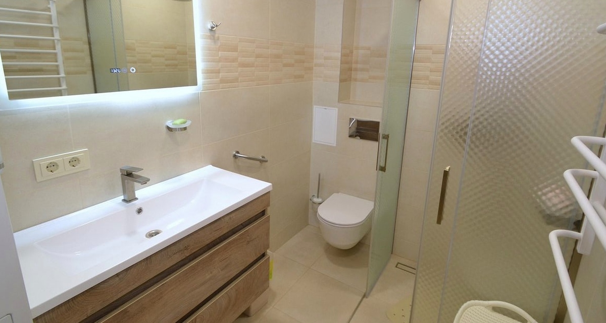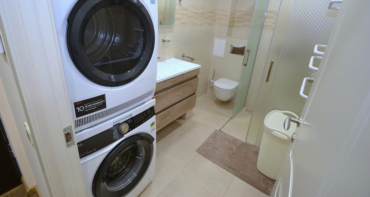 Bathroom: Equipped with a shower cabin, a sink with a mirror, a toilet, plus a washer and a dryer.