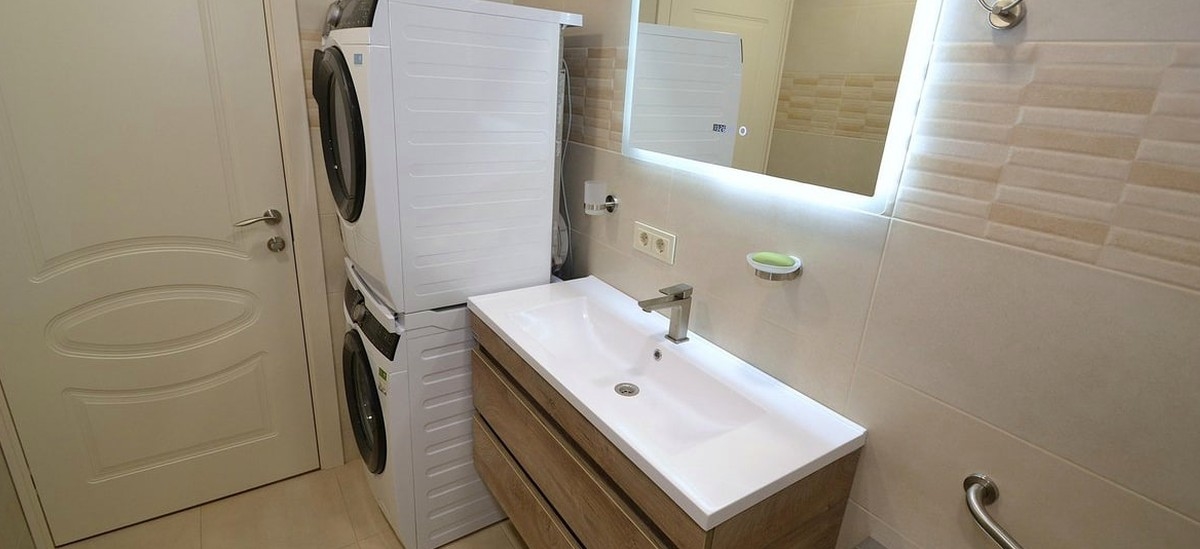 Bathroom: Equipped with a shower cabin, a sink with a mirror, a toilet, plus a washer and a dryer.